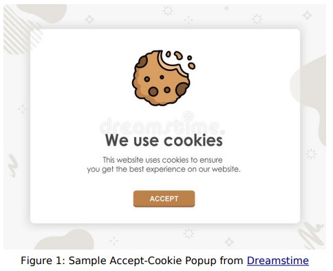 Anytime you have been online through a web browser such as Chrome, Firefox, Opera or even Edge, then you probably have picked up a few cookies and you have probably clicked on a popup that looks like Figure 1.