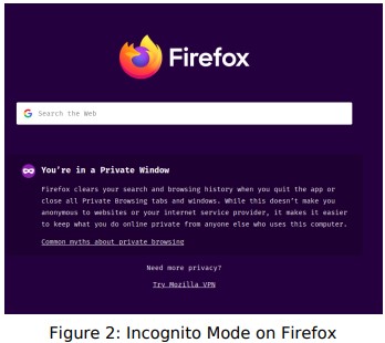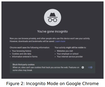 - Browse in Incognito Mode. Many popular browsers offer the option of browsing privately. This is the incognito mode. While Incognito browsing offers some privacy, it does not provide total anonymity. In fact, when you open an Incognito window, it explicitly states that your browsing activity might still be visible to websites you visit, your employer or school, and your internet service provider. The main thing it does is hide your browsing history from other people who use the same computer. It essentially deletes the history of any websites you may visit during the session, saves no information you may enter in forms you fill out and deletes any “cookies” that you might collect along the way. Figure 2 below shows th Incognito Mode on Google Chrome while Figure 3 shows how it appears on Firefox.