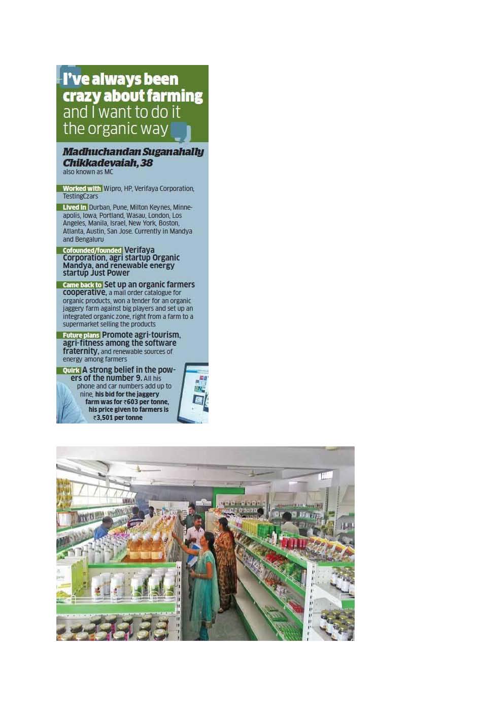 With the bubbling enthusiasm of a 10-yearold, MC translated the dream into action by setting up an integrated organic zone at Budanur, Mandya, on the Bengaluru-Mysuru state highway. This is the second-most passenger-heavy highway in India after Pune-Mumbai — MC did a study — and the location was ideal to generate a lot of eyeballs.
